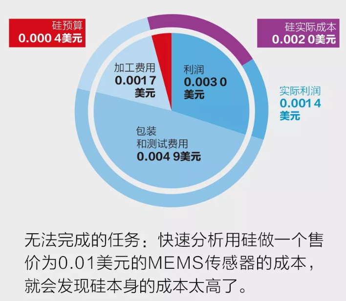 我們通過簡(jiǎn)單的數(shù)學(xué)題來闡釋這一問題。(如果不想看,可直接跳至下一段。)如果1平方毫米的傳感器的售價(jià)為0.01美元,那么制造商制造該傳感器的成本不應(yīng)超過0.007美元,因?yàn)榇蠖鄶?shù)制造商希望在銷售該傳感器時(shí)至少能獲得30%的利潤(rùn)率,即0.003美元的利潤(rùn)。根據(jù)當(dāng)今制造傳感器的經(jīng)驗(yàn)法則,MEMS芯片的成本約為最終傳感器成品成本的30%,其余70%的成本用于傳感器的包裝、測(cè)試、電子數(shù)據(jù)讀出和校準(zhǔn)。因此, MEMS芯片的成本就只能為0.007美元的30%,即約0.002美元。最后,硅材料大約占未包裝MEMS芯片成本的20%。這留給傳感器硅的預(yù)算僅為0.000 4美元。