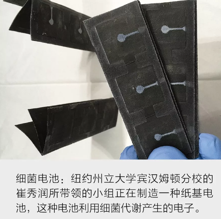 在紐約州立大學(xué)賓漢姆頓分校,崔秀潤(rùn)(Seokheun Choi)小組正在開發(fā)一種紙基電池,這種電池具有一種非傳統(tǒng)的電子來源——細(xì)菌??梢栽谀嗫永镎业侥承┘?xì)菌,在代謝食物時(shí)產(chǎn)生電子。這些細(xì)菌附著在印在紙上的金屬電極上,金屬電極收集排放出的電子。產(chǎn)生幾微安培的電流需要一堆細(xì)菌電池,這通過折紙手工很容易實(shí)現(xiàn)——只需將紙多折疊幾次。