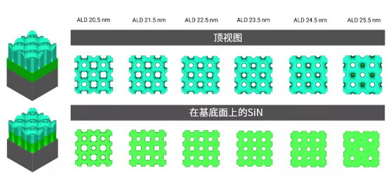SEMulator3D中可以通過ALD厚度實(shí)驗(yàn)設(shè)計(jì)確定這一最佳厚度。該模擬的結(jié)果如圖5所示,刻蝕自上而下的形狀和底部橫截面也可見。隨著ALD厚度的增加,SiN /基底界面處的孔形狀從方形變?yōu)閳A形,并且逐漸變小。在足夠的ALD厚度下,菱形孔的尖端可視度有限,這會(huì)導(dǎo)致較低的刻蝕速率且刻蝕保持圓形。在23.5nm的ALD厚度下得到了此次剖面SiO2和SiN刻蝕工藝最均勻的孔形狀。