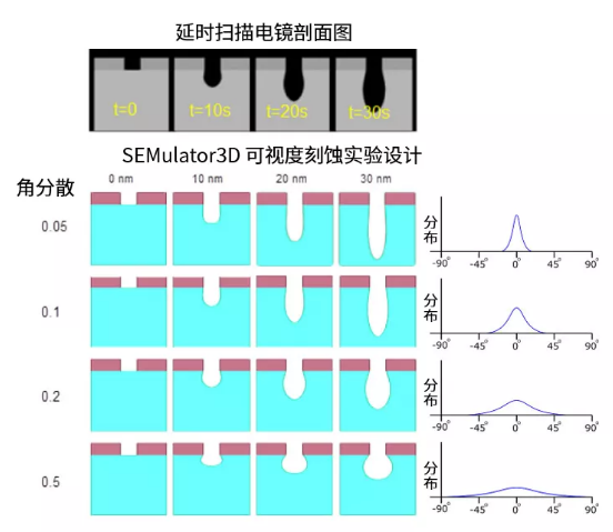 圖3:模擬實(shí)驗(yàn)設(shè)計(jì)與延時(shí)SEM的比較。模擬實(shí)驗(yàn)設(shè)計(jì)使用了恒定刻蝕量和不同的角分散(高斯分布的標(biāo)準(zhǔn)差),進(jìn)行模擬并顯示增量材料刪除步驟失效。右側(cè)的直方圖說明了角度分布與軟件中數(shù)值設(shè)置的相關(guān)性(不按比例)??涛g工藝的實(shí)際角分散是通過找到與刻蝕輪廓最匹配的模擬實(shí)驗(yàn)設(shè)計(jì)結(jié)果來確定的。