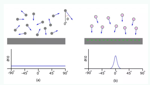 圖1a:中性氣體在腔室內(nèi)隨機(jī)流動(dòng)的二維展示。氣體的行進(jìn)角度在圖中描繪的所有方向上均等分布(圖1a)。圖1b:顯示了帶正電的離子和一個(gè)帶負(fù)電的晶圓。離子會(huì)因電場(chǎng)而向下加速;然而,由于隨機(jī)熱效應(yīng)和與其他離子或氣體分子的碰撞,完美垂直軌跡無法實(shí)現(xiàn)。角速度分布可以近似為高斯函數(shù)(圖1b)。