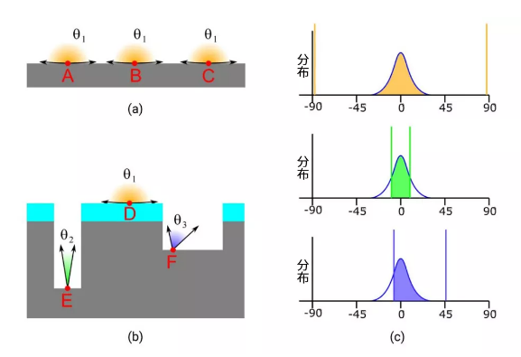圖2a:在平面晶圓表面,每個(gè)位置(A、B、C、D)完全暴露在腔室中(開口角為180°),并且接收各個(gè)方向的全部離子通量。圖2b:在凹坑和溝槽(E、F)底部,腔室視線內(nèi)的角度范圍減小??涛g速率可以表示為角度范圍內(nèi)的分布積分(垂直線之間曲線下的陰影區(qū)域)。