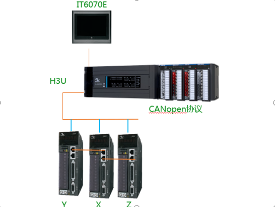 采用匯川H3U PLC與伺服之間采用Canopen通訊,采用以太網(wǎng)實(shí)現(xiàn)觸摸屏與PLC之間的通訊,采用手搖輪直接接入伺服CN1端子以AB相4倍頻進(jìn)行手動(dòng)控制,觸摸屏采用本機(jī)地址進(jìn)行上萬(wàn)組配方處理