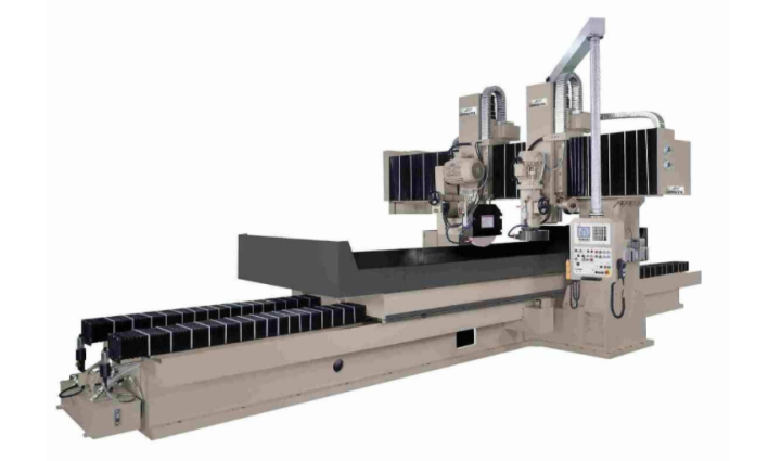 精密龍門磨床主要用砂輪周邊磨削加工大型短寬工件的平面。磨削時(shí)工件可直接固定在工作臺(tái)面上或電磁吸盤上。龍門磨床采用龍門式布局,包括床身、雙立柱、橫梁組成封閉的剛性框架結(jié)構(gòu)。床身采用雙V型導(dǎo)軌,工作臺(tái)導(dǎo)軌面覆有耐磨聚四氟乙烯。拖板沿橫梁導(dǎo)軌作橫向運(yùn)動(dòng),橫向進(jìn)給由直流電動(dòng)機(jī)驅(qū)動(dòng),由數(shù)控進(jìn)給。工作臺(tái)縱向運(yùn)動(dòng)由葉片油泵驅(qū)動(dòng)??蔁o級(jí)調(diào)速,采用開式液壓系統(tǒng),液壓油與導(dǎo)軌潤滑有油溫控制裝置。磨頭可沿拖板垂直導(dǎo)軌做上下移動(dòng)。垂直進(jìn)給有快速和自動(dòng)、手動(dòng)進(jìn)給兩種方式。磨頭主軸采用套筒式結(jié)構(gòu)和連接式傳動(dòng),主軸軸承為高精度向心推力球軸承。