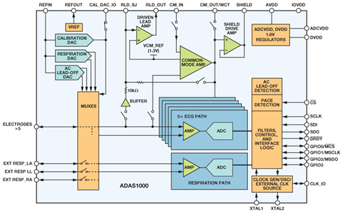 ADAS1000是ADI專門針對監(jiān)控級和診斷級心電圖測量而設(shè)計,由5個電極輸入和1個專用右腿驅(qū)動(RLD)輸出參考電極構(gòu)成,旨在簡化采集和確保高質(zhì)量ECG信號的任務(wù)。為了簡化產(chǎn)線測試、開發(fā)以及提供整體上電測試,ADAS1000提供了許多特性。例如,通過校準DAC提供直流和交流測試激勵、循環(huán)冗余校驗(CRC)冗余測試,以及對所有相關(guān)寄存器地址空間的回讀功能。輸入結(jié)構(gòu)為差分放大器輸入,允許用戶選擇不同配置方案來實現(xiàn)優(yōu)質(zhì)應(yīng)用。